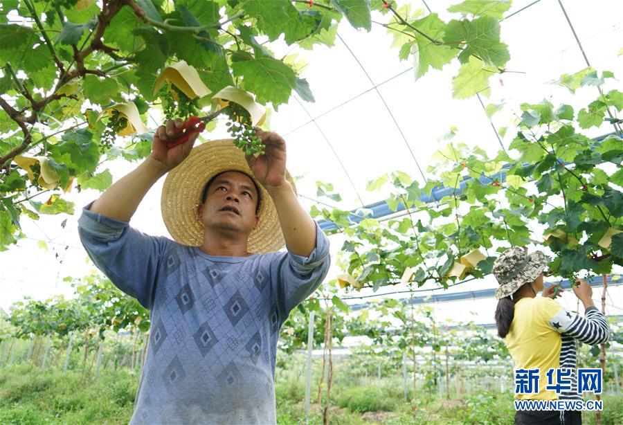 5月13日,在福建省建甌市小橋鎮(zhèn)陽澤村誠源果蔬專業(yè)合作社,村民在修剪葡萄枝葉。誠源果蔬專業(yè)合作社有葡萄園100多畝,產(chǎn)品供應(yīng)北京上海市場(chǎng),村民可以在葡萄園內(nèi)從事季節(jié)性工作。新華社記者賀燦鈴攝