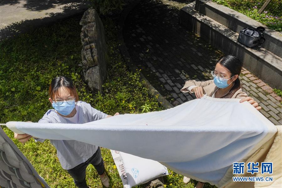 5月15日,在西南大學一棟宿舍樓下,一名返校大學生(左)在輔導員老師的幫助下曬被子。當日,重慶西南大學迎來疫情以來首批返校大學生。據(jù)介紹,按照疫情防控的需要,重慶市高校2020年春季學期從5月11日起按照“一校一策”原則,實行錯峰錯時分批次有序開學復課。新華社記者劉潺攝