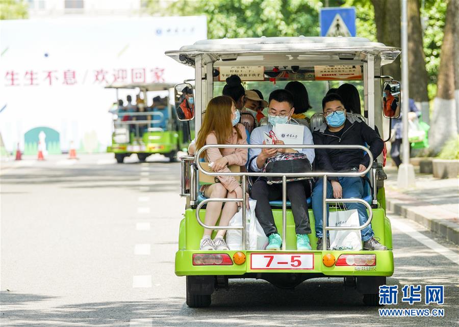 5月15日,在西南大學(xué)校園內(nèi),學(xué)生們搭乘校內(nèi)轉(zhuǎn)運(yùn)車前往各自的宿舍。當(dāng)日,重慶西南大學(xué)迎來(lái)疫情以來(lái)首批返校大學(xué)生。據(jù)介紹,按照疫情防控的需要,重慶市高校2020年春季學(xué)期從5月11日起按照“一校一策”原則,實(shí)行錯(cuò)峰錯(cuò)時(shí)分批次有序開(kāi)學(xué)復(fù)課。新華社記者劉潺攝