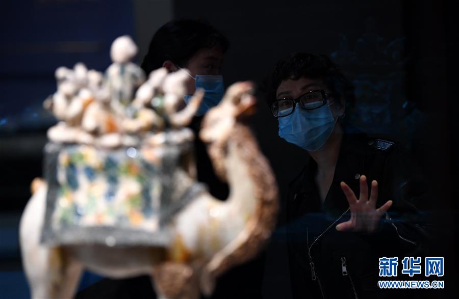 游客在陜西歷史博物館參觀唐三彩駱駝?shì)d樂俑(3月25日攝)。新華社記者 李一博 攝