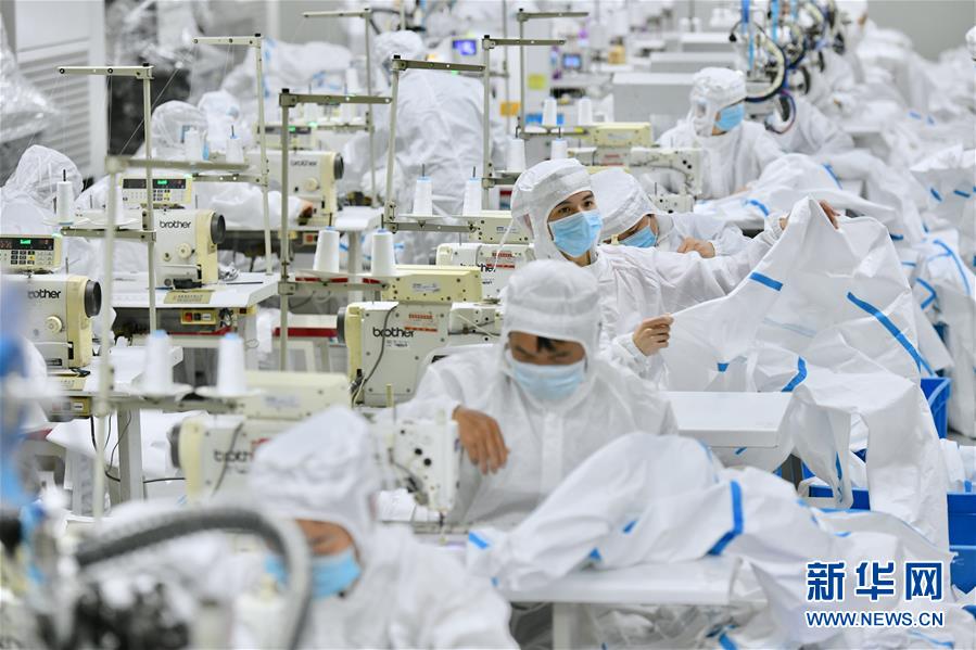 在福建晉江,工人在生產(chǎn)防護服(2月4日攝)。新華社記者姜克紅攝