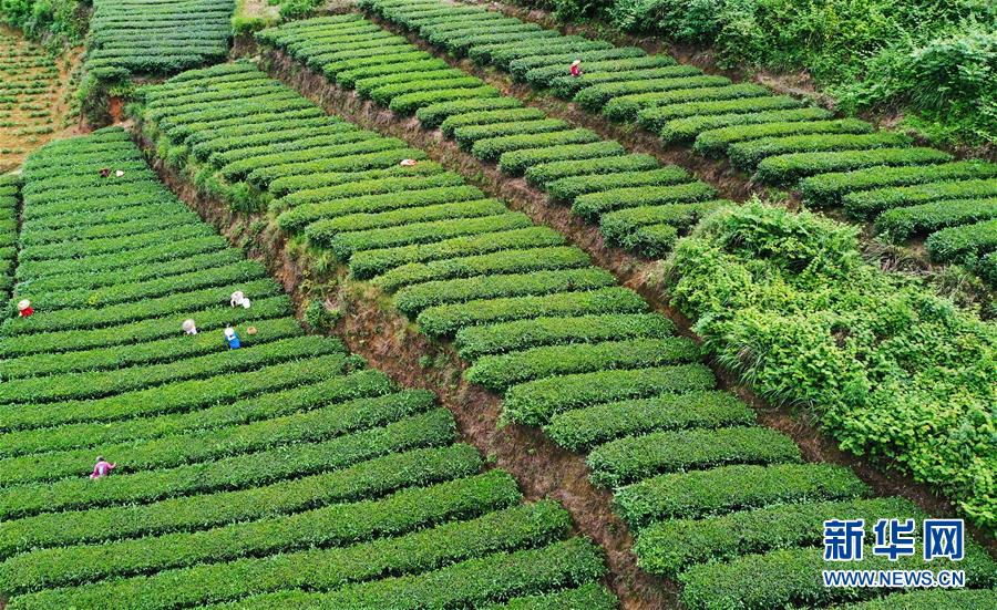 5月17日,村民在新院村茶葉基地采摘夏茶(無(wú)人機(jī)照片)。新華社記者王全超攝