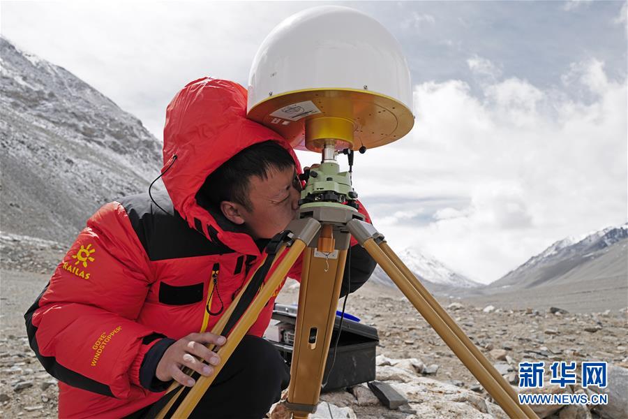 國(guó)測(cè)一大隊(duì)隊(duì)員在珠峰大本營(yíng)附近測(cè)試設(shè)備(4月27日攝)。新華社記者普布扎西攝