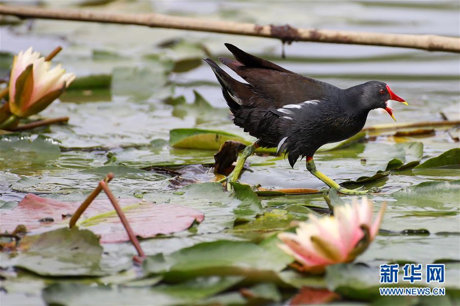 5月22日,一只紅嘴水雞在蓮葉間行走。近日,貴陽市觀山湖公園內(nèi)大片盛開的蓮花吸引了不少水鳥在其間嬉戲覓食。新華社記者劉續(xù)攝