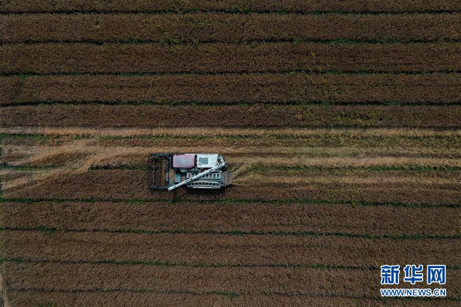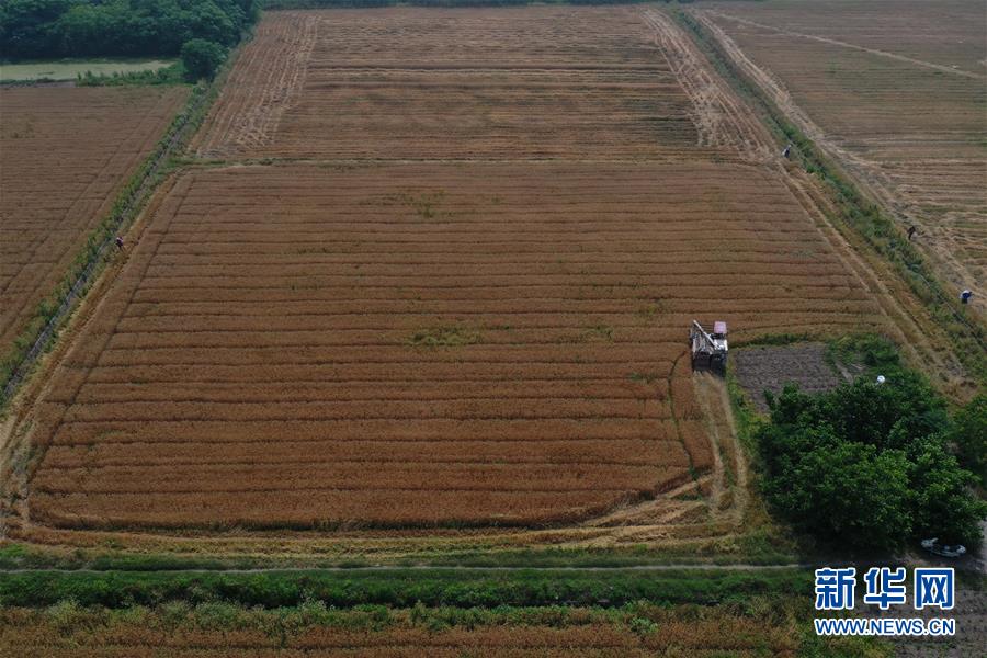 5月24日,農(nóng)戶駕駛收割機在浙江省湖州市吳興區(qū)八里店鎮(zhèn)尹家圩糧油植保農(nóng)機專業(yè)合作社的麥田里進(jìn)行收割作業(yè)(無人機照片)。新華社記者黃宗治攝