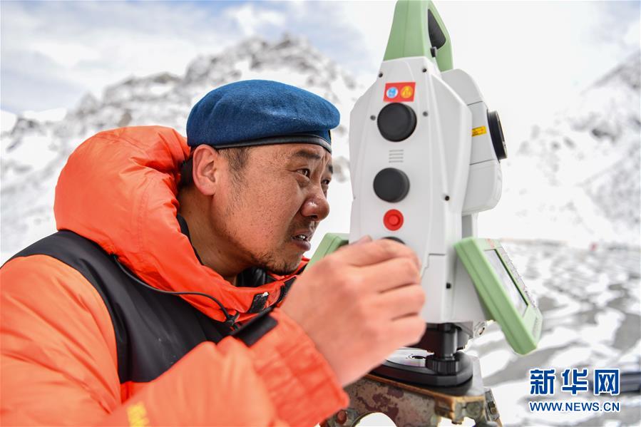 自然資源部第一大地測量隊隊員鄭林在使用全站儀對珠峰峰頂進(jìn)行交會觀測(5月27日攝)。新華社記者晉美多吉攝