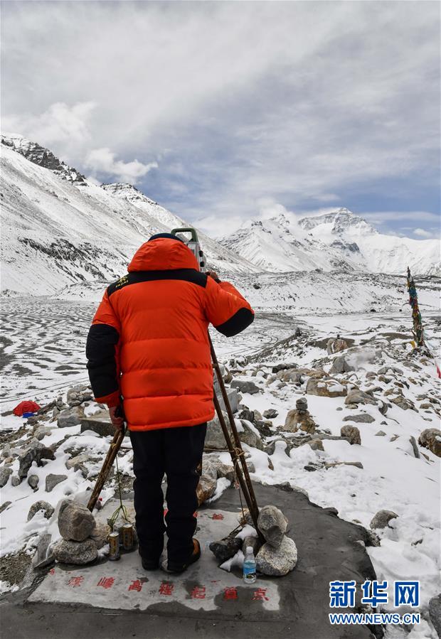 自然資源部第一大地測量隊隊員鄭林在使用全站儀對珠峰峰頂進行交會觀測(5月27日攝)。新華社記者普布扎西攝