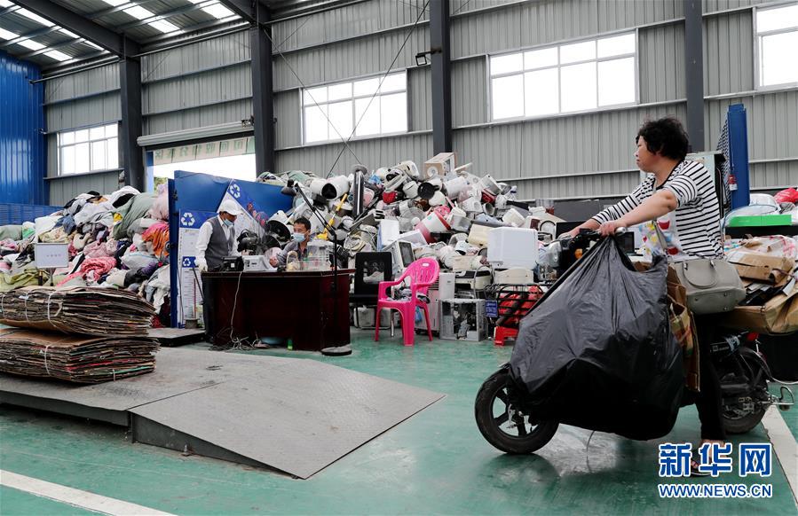5月27日,一位街道居民將自己日常收集到的可回收物送到中轉服務站。新華社記者方喆攝