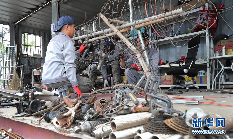 5月27日,制作團隊成員李剛在中轉服務站工棚內,用廢舊鋼絲制作牛造型工藝品的身體部分。新華社記者方喆攝