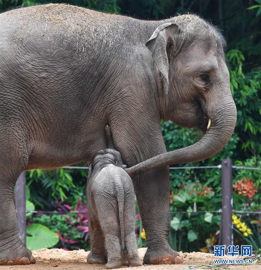 5月27日,廣州長(zhǎng)隆的新生亞洲象寶寶在吃奶。在不到一個(gè)月的時(shí)間內(nèi),廣州長(zhǎng)隆野生動(dòng)物世界的亞洲象家族迎來(lái)兩名新丁。4月30日,亞洲象莉娜產(chǎn)下一頭公象,出生時(shí)體重88公斤;5月12日,亞洲象伊拉產(chǎn)下一頭母象,出生體重達(dá)108公斤。大象媽媽莉娜和伊拉均為長(zhǎng)隆野生動(dòng)物世界亞洲象種群繁育基地繁殖的亞洲象。至此,長(zhǎng)隆亞洲象家族已繁衍至第三代,現(xiàn)共有27頭大象。新華社記者劉大偉攝