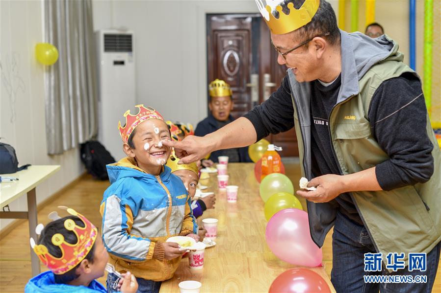 5月27日,玉麥鄉(xiāng)小學(xué)校長朗杰和孩子們一起慶?!吧铡?。新華社記者王炳坤攝