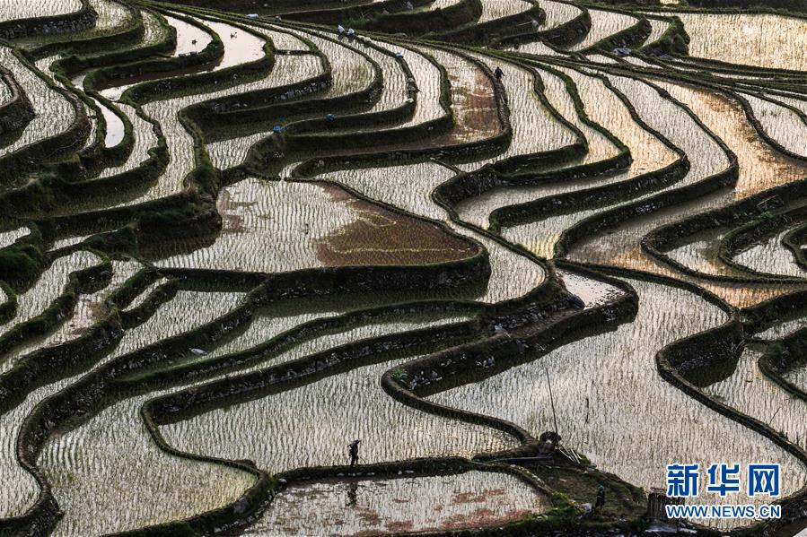 晨光中的從江縣加榜鄉(xiāng)加車梯田(5月28日攝)。夏日時(shí)節(jié),位于貴州省黔東南苗族侗族自治州從江縣加榜鄉(xiāng)加車、加頁、黨扭等苗寨的梯田在晨霧與陽光的映襯下線條分明,光影變幻,景色如畫。新華社記者 楊文斌 攝