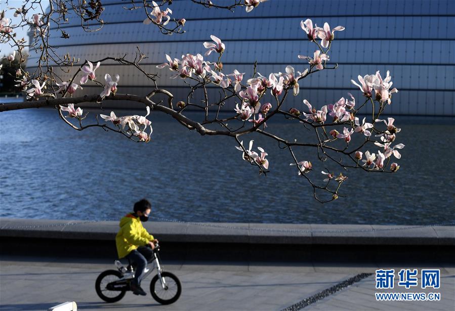 北京國(guó)家大劇院,小男孩在吐露芬芳的玉蘭花下騎車(3月14日攝)。新華社記者羅曉光攝