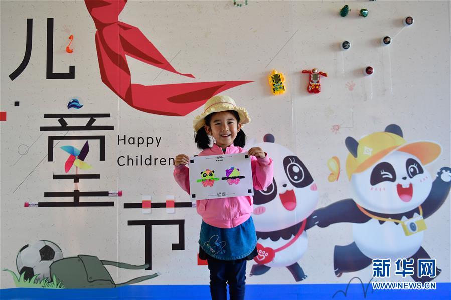 5月31日,小朋友在西寧熊貓館內(nèi)制作熊貓擺件。新華社記者張龍攝