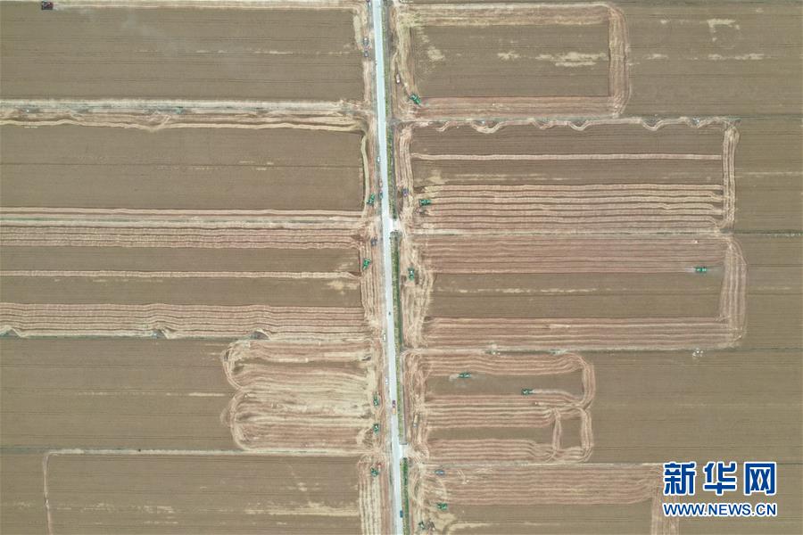 6月2日,在河南省黃泛區(qū)農(nóng)場九分場的麥田里,農(nóng)民操作大型收割機收獲小麥(無人機照片)。新華社記者馮大鵬攝。