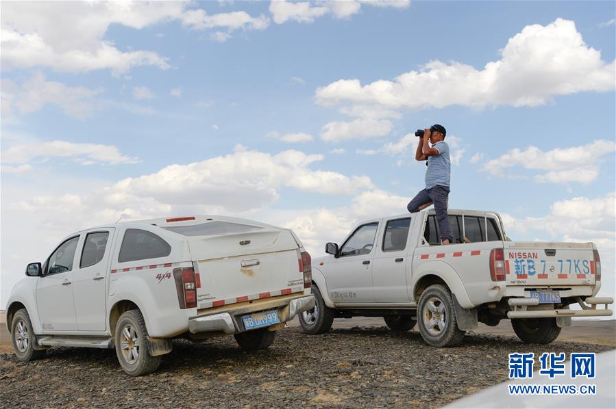 在新疆卡拉麥里山有蹄類野生動物自然保護區(qū),管護員阿達(dá)比亞特在觀察遠(yuǎn)處水源地蓄水情況(6月3日攝)。新華社記者丁磊攝。