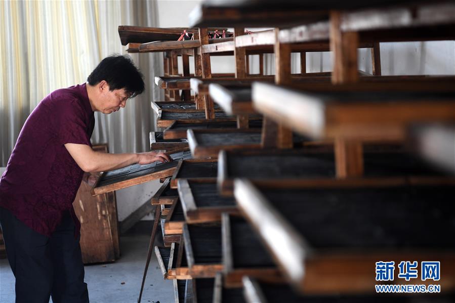 5月20日,安徽省非物質(zhì)文化遺產(chǎn)徽墨代表性傳承人項德勝在查看通風晾制的墨。新華社記者劉軍喜攝。