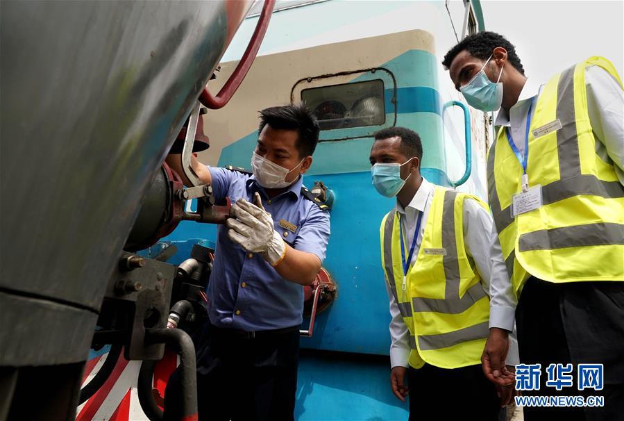 6月5日,帶教司機在教伊迪內卡邱(中)和特瑞薩(右)進行機車檢查作業(yè)。 新華社記者 李安 攝