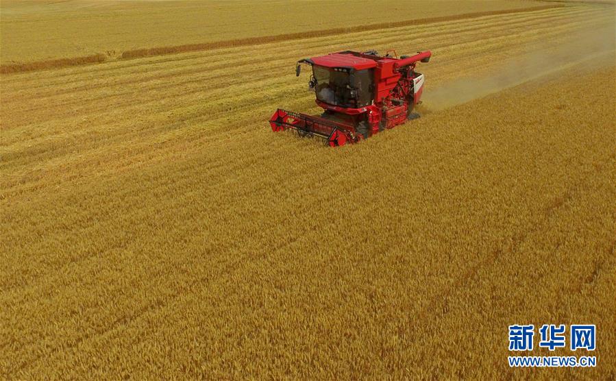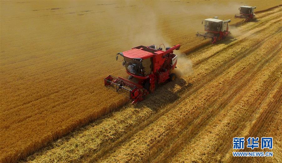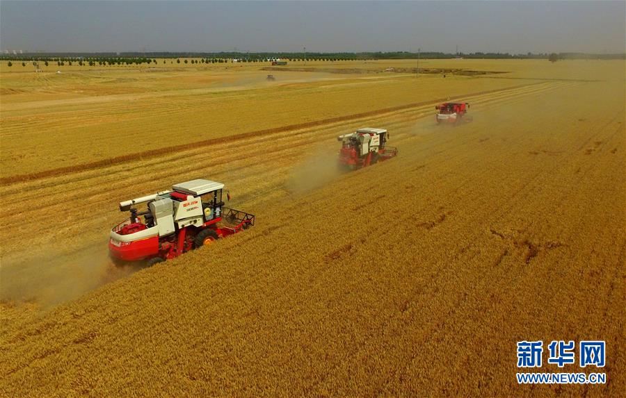 6月8日,聯(lián)合收割機在河北省南和縣閆里鄉(xiāng)閆里村麥田進行夏收作業(yè)(無人機照片)?!叭摹逼陂g,河北省預計組織和調(diào)度小麥聯(lián)合收割機、拖拉機、夏玉米播種機等200萬臺農(nóng)業(yè)機械投入作業(yè)。新華社記者朱旭東攝