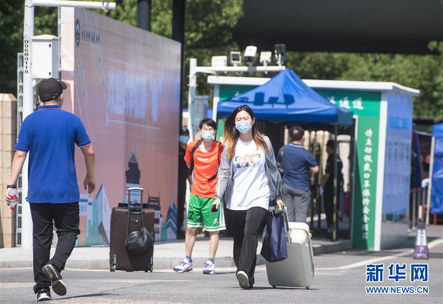 6月8日,在武漢大學(xué),返校學(xué)生掃健康碼以及測(cè)體溫后進(jìn)入宿舍。6月8日起,武漢大學(xué)、華中科技大學(xué)、武漢理工大學(xué)、華中師范大學(xué)等多所武漢高校迎來首批返校畢業(yè)生。新華社記者肖藝九攝