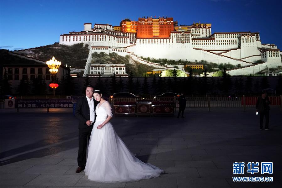 人們在布達拉宮廣場拍照(6月8日攝)。夜幕降臨,西藏拉薩布達拉宮燈光璀璨,夜景迷人。新華社記者詹彥攝