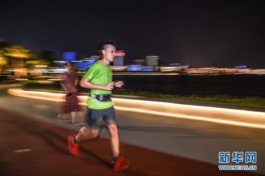 一位市民在??谑兰o公園濱海步道夜跑(5月15日拍攝)。近年來,夜跑成為越來越多都市人熱衷的健身方式之一。在海南海口,每當夜幕降臨,“夜跑族”來到??谌f綠園、世紀公園等夜跑場所跑步,用一身酣暢淋漓的汗水擺脫白天工作中的壓力,享受跑步帶來的歡愉。新華社記者 蒲曉旭 攝