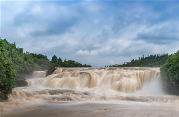 2019年6月8日,貴州安順,黃果樹瀑布進入豐水期。圖為黃果樹大瀑布上游的陡坡塘瀑布。