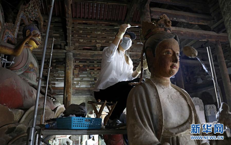 6月8日,工作人員對奉國寺的彩繪泥塑進(jìn)行保護修復(fù)。