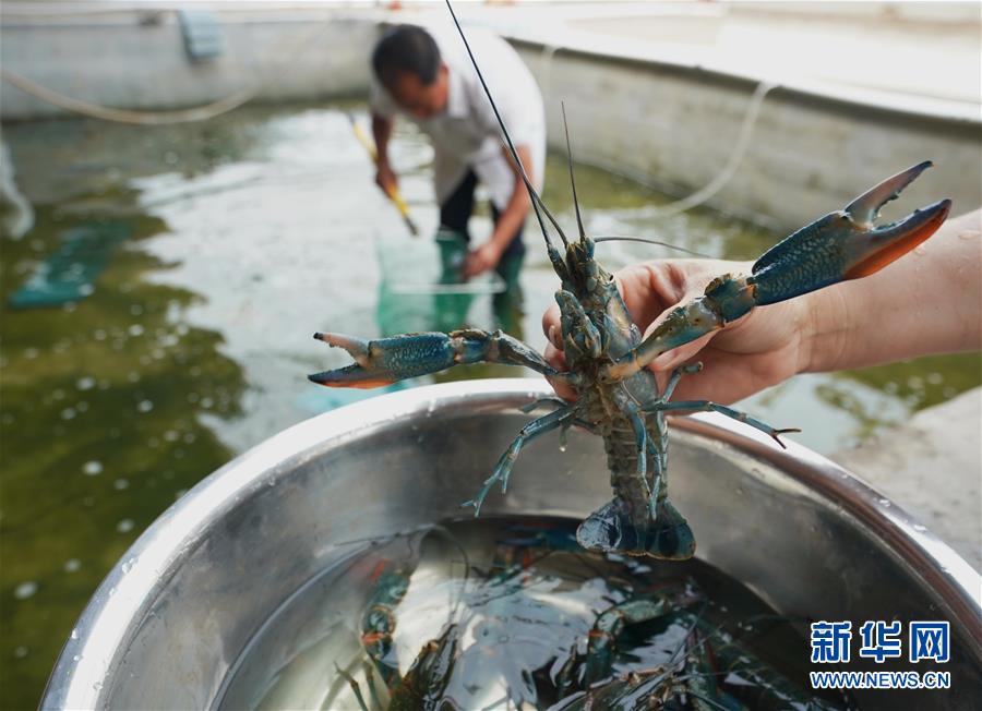 6月16日,在盧龍縣印莊鄉(xiāng)榆林甸村永新水產養(yǎng)殖專業(yè)合作社的養(yǎng)殖基地,養(yǎng)殖戶劉玉永在展示一只澳洲淡水龍蝦。新華社記者 楊世堯 攝