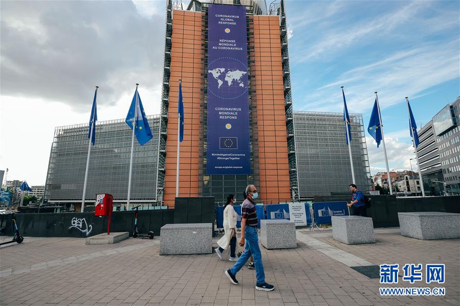 6月13日,在比利時(shí)布魯塞爾,戴口罩的行人走過歐盟委員會(huì)總部大樓。新華社記者 張鋮 攝
