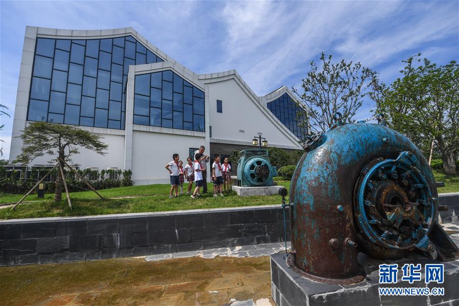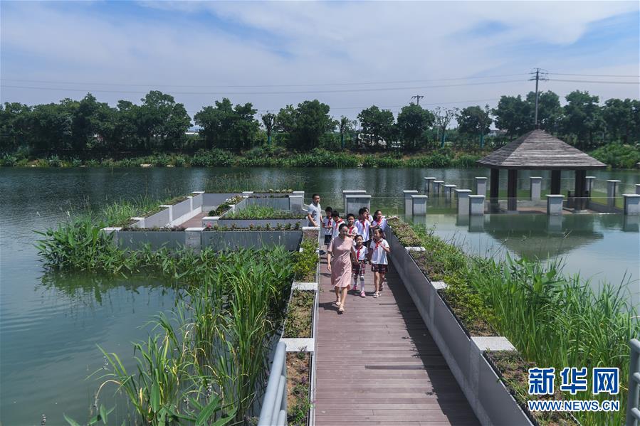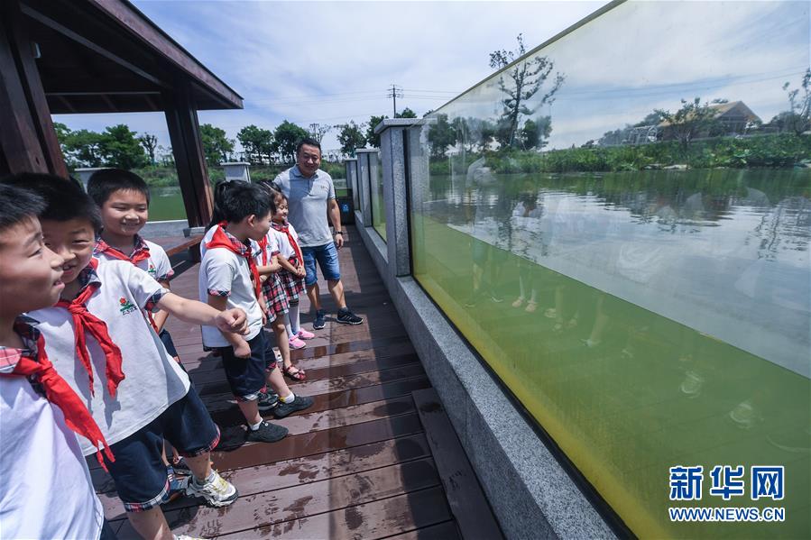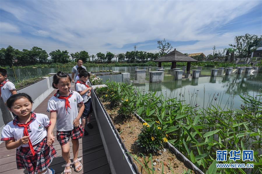 6月17日,洛舍鎮(zhèn)中心學校的師生們參觀水情館的室外園區(qū)。新華社記者 徐昱 攝
