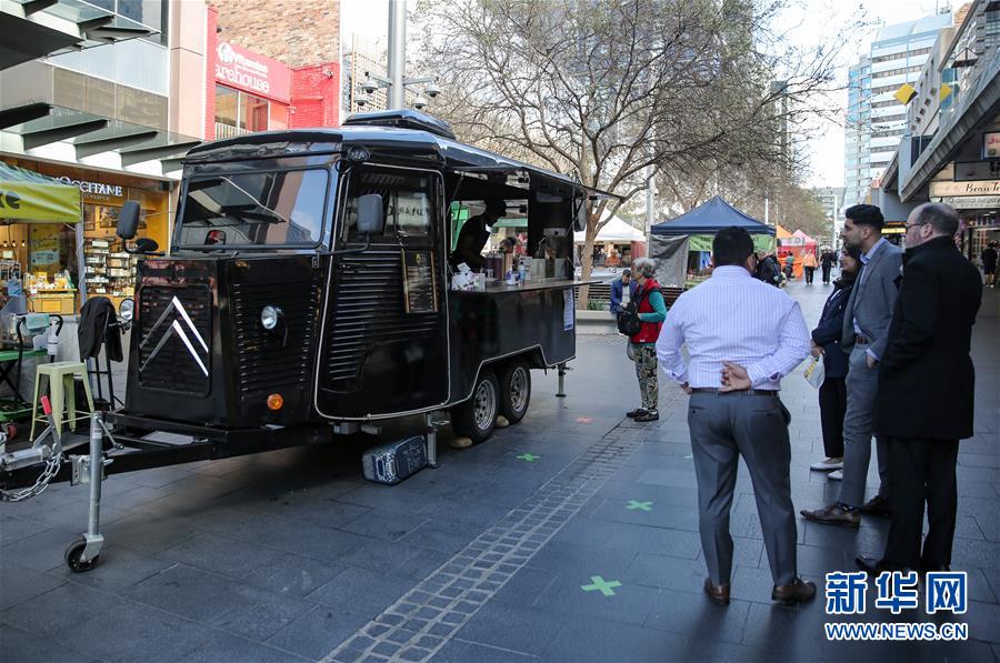6月19日,人們?cè)诎拇罄麃喯つ岵榇奈榈骆?zhèn)的咖啡餐車前等候。新華社記者白雪飛攝