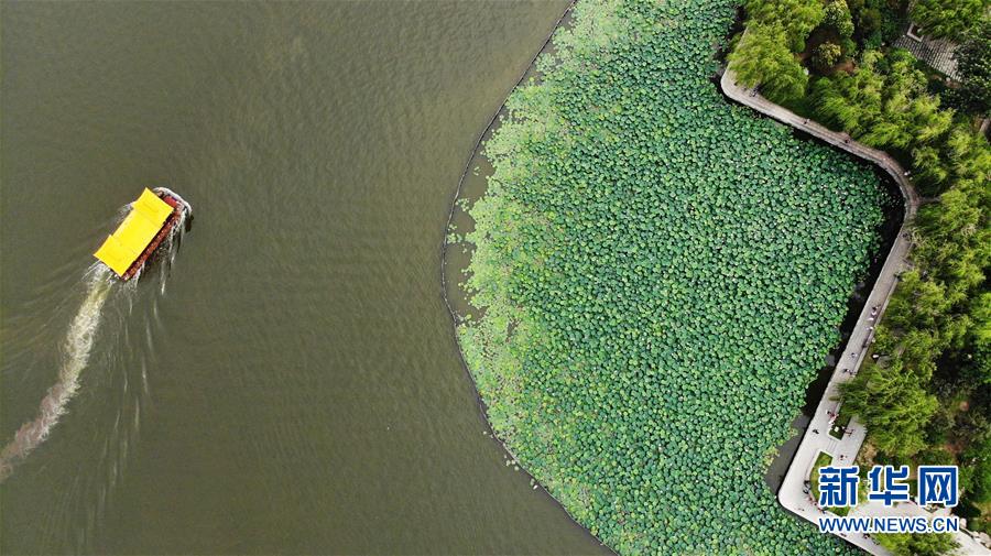 6月19日拍攝的大明湖畔的荷花池(無人機照片)。近日,山東濟(jì)南大明湖的荷花陸續(xù)綻放,吸引游客前來觀賞。新華社記者 王凱 攝