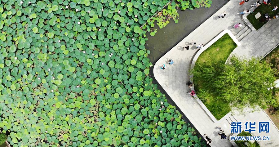 6月19日拍攝的大明湖畔的荷花池(無人機照片)。近日,山東濟南大明湖的荷花陸續(xù)綻放,吸引游客前來觀賞。新華社記者 王凱 攝