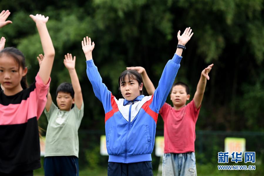 6月19日,在金寨縣三合實(shí)驗(yàn)學(xué)校,蔡齊艷和同學(xué)一起上體育課。新華社記者張端攝