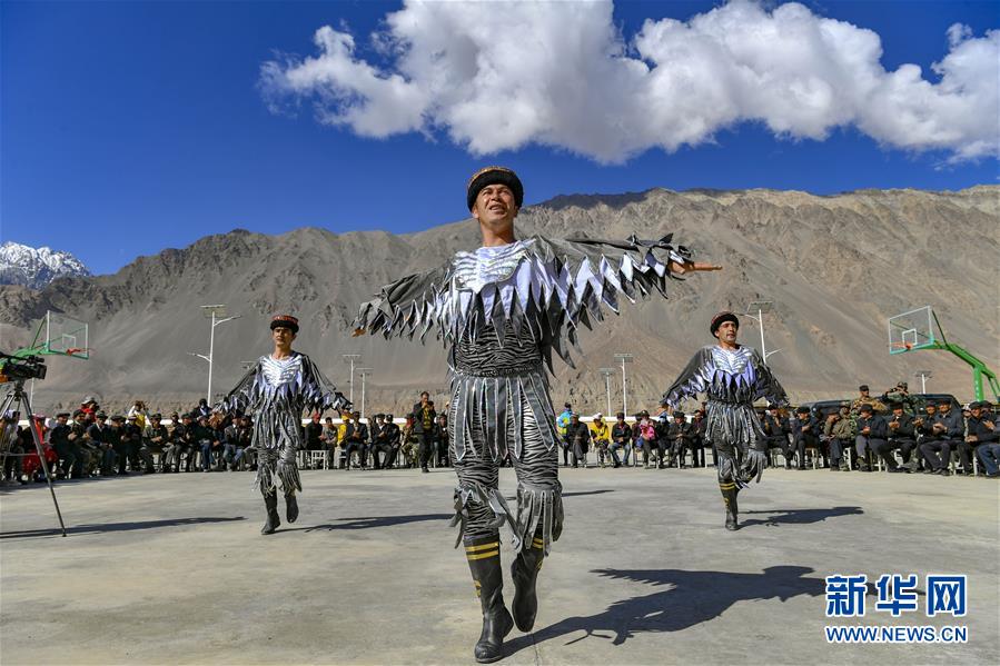 新疆塔什庫爾干塔吉克自治縣文工團演員在熱斯喀木村表演塔吉克族鷹舞(6月6日攝)。新華社記者胡虎虎攝