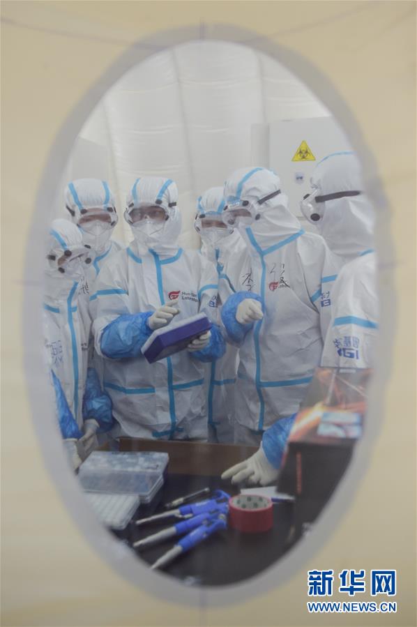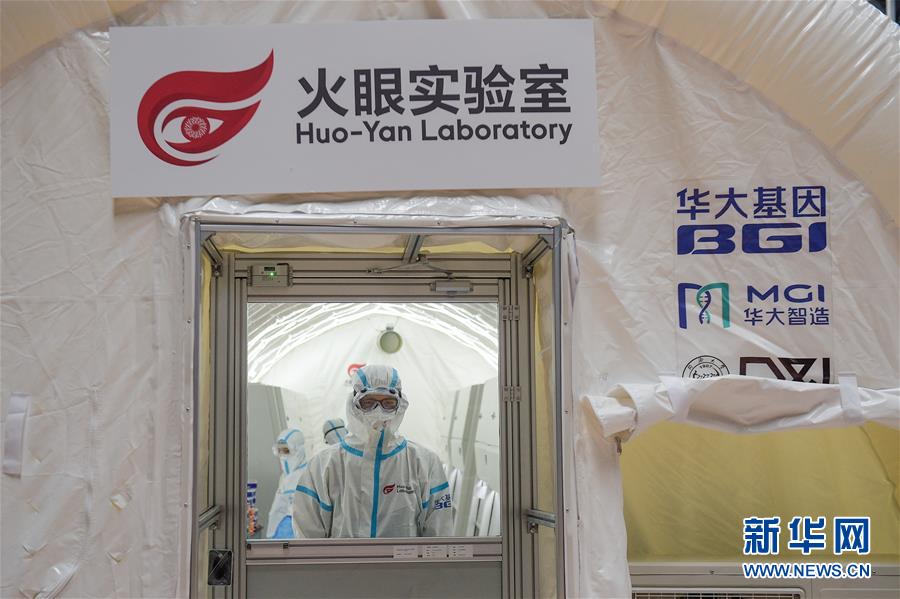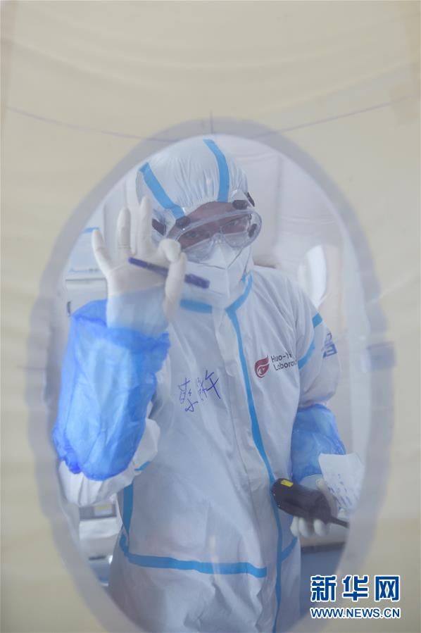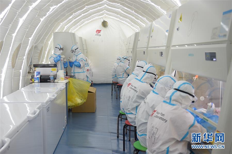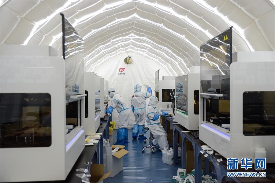 出于北京市疫情防控工作的需要,北京大興區(qū)體育中心綜合館內(nèi)正在搭建一個可移動、自動化、大通量的核酸檢測實驗室。目前,工人們正在緊張地進(jìn)行設(shè)備安裝和調(diào)試。據(jù)介紹,氣膜版“火眼”核酸檢測實驗室6月19日下午開始搭建。兩天多時間基本上完成了設(shè)備安裝和調(diào)試。9個高3.5米、占地70多平方米的拱形白色氣膜艙已搭建完畢,14臺自動化核酸提取設(shè)備準(zhǔn)備就緒。這個北京首座氣膜版“火眼”核酸檢測實驗室正式運轉(zhuǎn)后,實驗室核酸檢測能力可達(dá)到每天上萬人份,緩解當(dāng)前核酸檢測壓力。新華社記者彭子洋攝