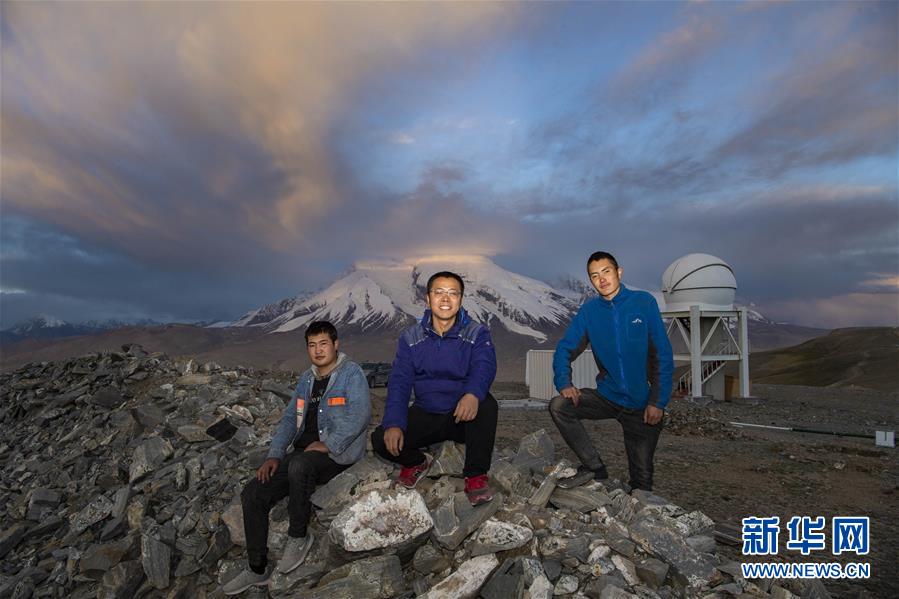 在中國科學(xué)院新疆天文臺慕士塔格觀測站,天文科技工作者馮國杰(中)、助理觀測員努爾蘭·卡納皮亞(左)、阿克力·圖拉提在慕士塔格峰下合影(6月15日攝)。