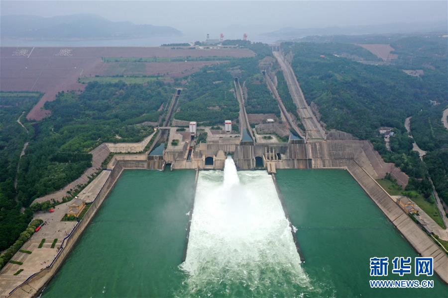 這是6月23日拍攝的黃河小浪底水利樞紐工程(無人機照片)。近日,黃河小浪底水利樞紐工程開啟洪水調度運用模式,從空中俯瞰,蔚為壯觀。新華社記者郝源攝