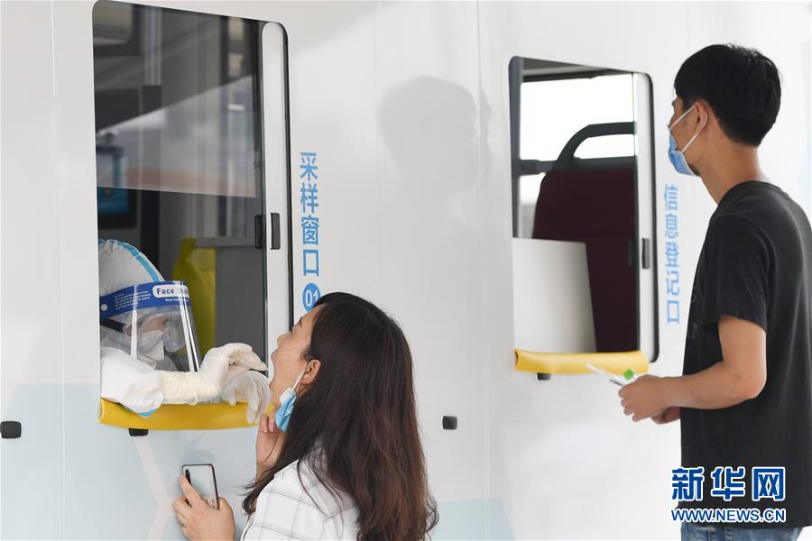 6月28日,在北京市西城區(qū)北京展覽館南側(cè)的露天廣場(chǎng)核酸檢測(cè)采樣點(diǎn),核酸檢測(cè)采樣車(chē)內(nèi)的醫(yī)護(hù)人員為前來(lái)做檢測(cè)的人員進(jìn)行采樣。新華社記者鞠煥宗攝