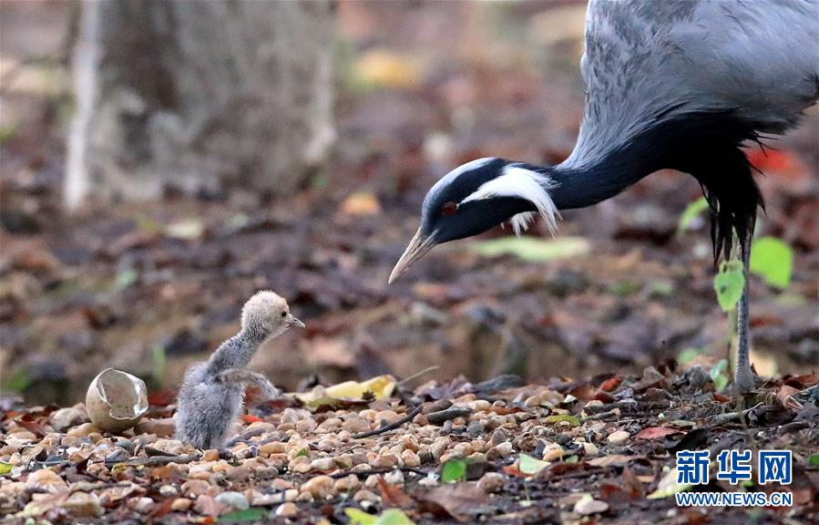 成年蓑羽鶴在照顧剛剛破殼的小鶴(6月23日攝)。新華社發(fā)(余會功攝)
