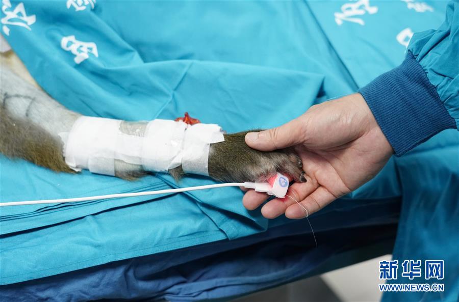6月29日,研究人員在病房?jī)?nèi)為移植肝受體猴按摩手部。日前,多基因編輯豬-恒河猴異種肝、心、腎器官移植在位于陜西西安的空軍軍醫(yī)大學(xué)西京醫(yī)院順利實(shí)施。研究團(tuán)隊(duì)使用豬內(nèi)源性逆轉(zhuǎn)錄病毒(PERV)敲除的13個(gè)基因修飾豬作為供體,將一個(gè)供體豬的肝、心、腎分別移植給3只恒河猴受體。目前,移植肝和對(duì)應(yīng)的受體猴已存活16天,突破國(guó)際上的豬-猴輔助性肝移植最長(zhǎng)存活時(shí)間記錄。這項(xiàng)研究有助于未來解決器官短缺造成的臨床器官移植發(fā)展受限難題。新華社記者邵瑞攝