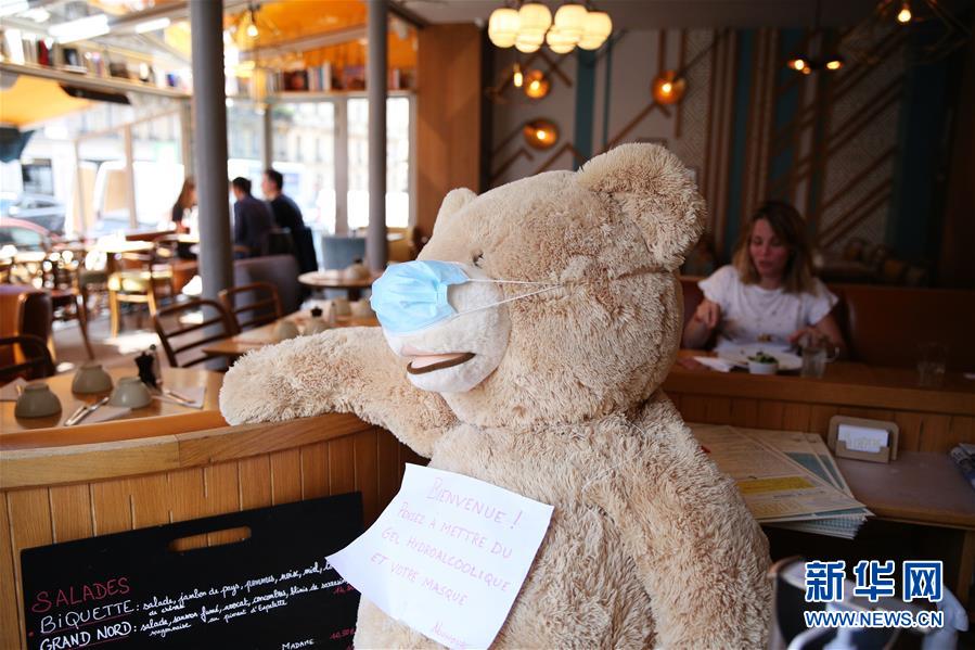 6月18日,在法國巴黎一家餐館內(nèi),一只毛絨玩具熊被戴上口罩,胸前掛著“歡迎光臨,請使用消毒洗手液并佩戴口罩”的牌子。新華社記者高靜攝
