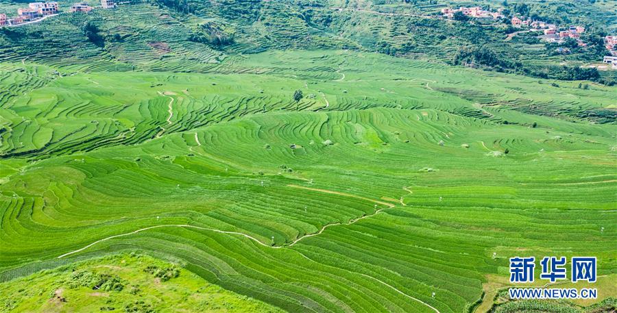 貴州省盤(pán)州市新民鎮(zhèn)的梯田風(fēng)光(6月29日攝,無(wú)人機(jī)照片)。夏日時(shí)節(jié),貴州省盤(pán)州市新民鎮(zhèn)的梯田風(fēng)景如畫(huà)。新華社記者陶亮攝