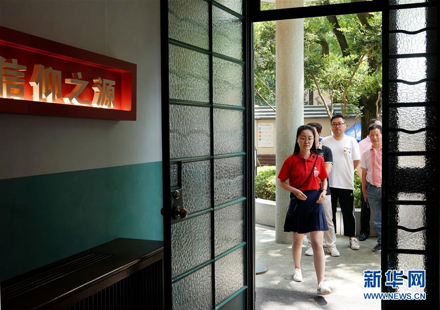 6月30日,復旦大學《共產(chǎn)黨宣言》展示館黨員志愿服務隊隊員、復旦大學數(shù)學科學學院學生張曉菲引領觀眾入館參觀。新華社記者劉穎攝