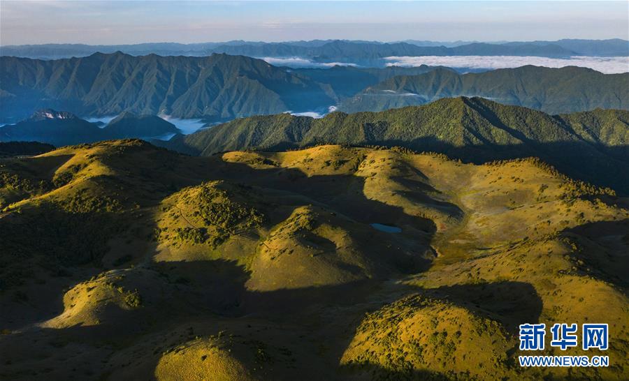 6月30日,朝霞照耀下的神田草甸與遠(yuǎn)處的群峰(無(wú)人機(jī)照片)。位于陜西省安康市嵐皋縣與重慶市城口縣交界處大巴山神田主脊北坡的神田草甸,面積超過(guò)1.1萬(wàn)畝。夏日的朝霞中,起伏的草甸仿佛一塊寬大無(wú)邊的綠色地毯,鑲嵌在大巴山上,如詩(shī)如畫(huà)。新華社記者陶明攝