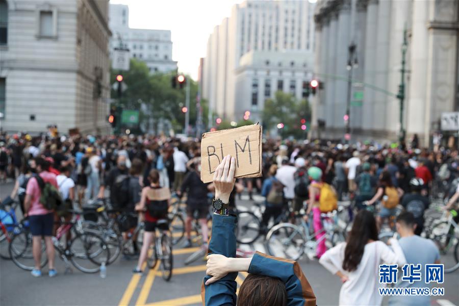 6月30日,一名抗議者在美國紐約市政廳附近手舉寫有“黑人的命也是命”縮寫的標(biāo)語參加抗議活動。由美國明尼蘇達(dá)州明尼阿波利斯市非裔男子弗洛伊德遭白人警察暴力執(zhí)法而死一事引發(fā)的各種抗議活動仍在紐約持續(xù)進(jìn)行。新華社記者王迎攝