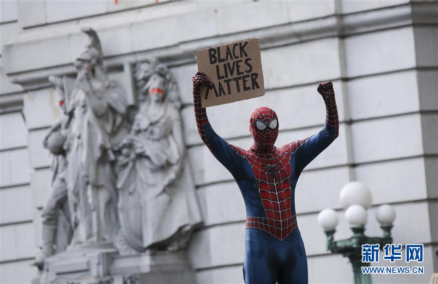 6月30日,一名打扮成“蜘蛛俠”的抗議者在美國紐約市政廳附近手舉寫有“黑人的命也是命”的標(biāo)語。由美國明尼蘇達(dá)州明尼阿波利斯市非裔男子弗洛伊德遭白人警察暴力執(zhí)法而死一事引發(fā)的各種抗議活動仍在紐約持續(xù)進(jìn)行。新華社記者王迎攝