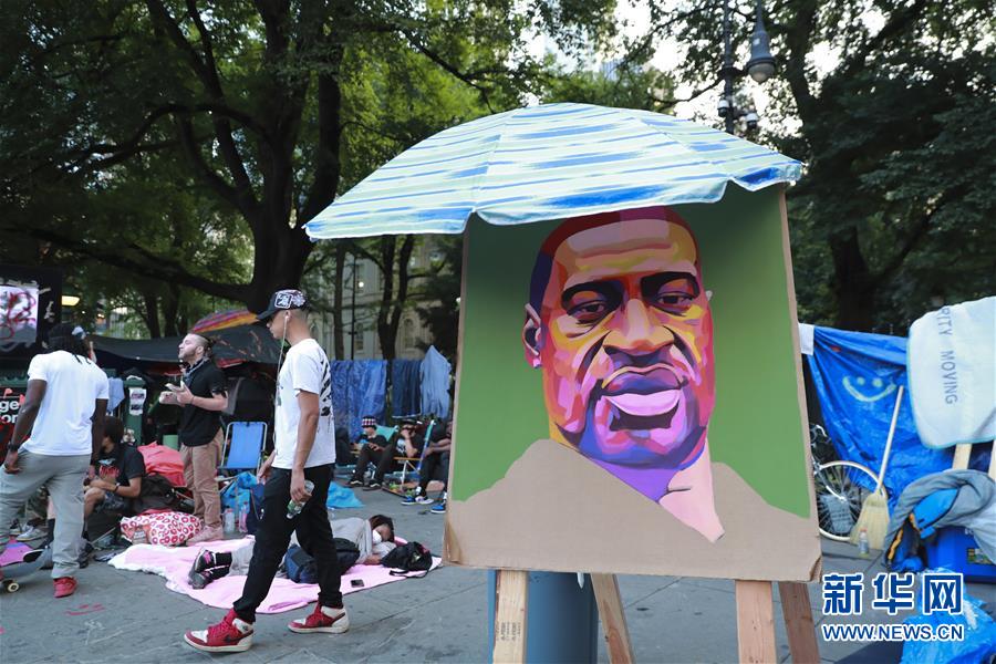 這是6月30日在美國紐約市政廳外“占領(lǐng)市政廳”抗議活動現(xiàn)場拍攝的弗洛伊德畫像。由美國明尼蘇達(dá)州明尼阿波利斯市非裔男子弗洛伊德遭白人警察暴力執(zhí)法而死一事引發(fā)的各種抗議活動仍在紐約持續(xù)進(jìn)行。新華社記者王迎攝