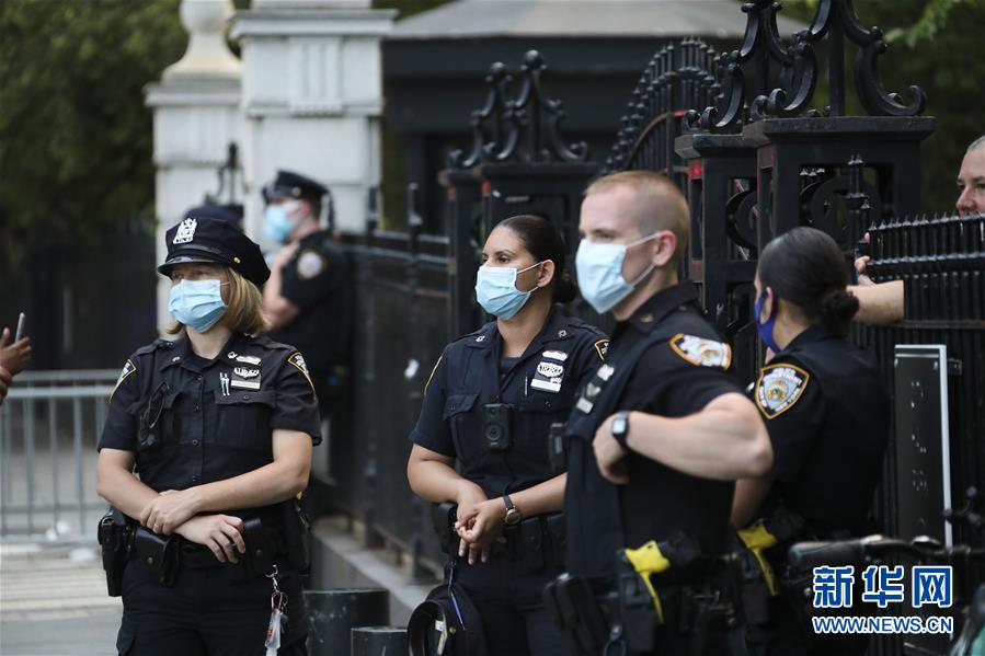 6月30日,警察在美國紐約市政廳附近執(zhí)勤。由美國明尼蘇達(dá)州明尼阿波利斯市非裔男子弗洛伊德遭白人警察暴力執(zhí)法而死一事引發(fā)的各種抗議活動仍在紐約持續(xù)進(jìn)行。新華社記者王迎攝